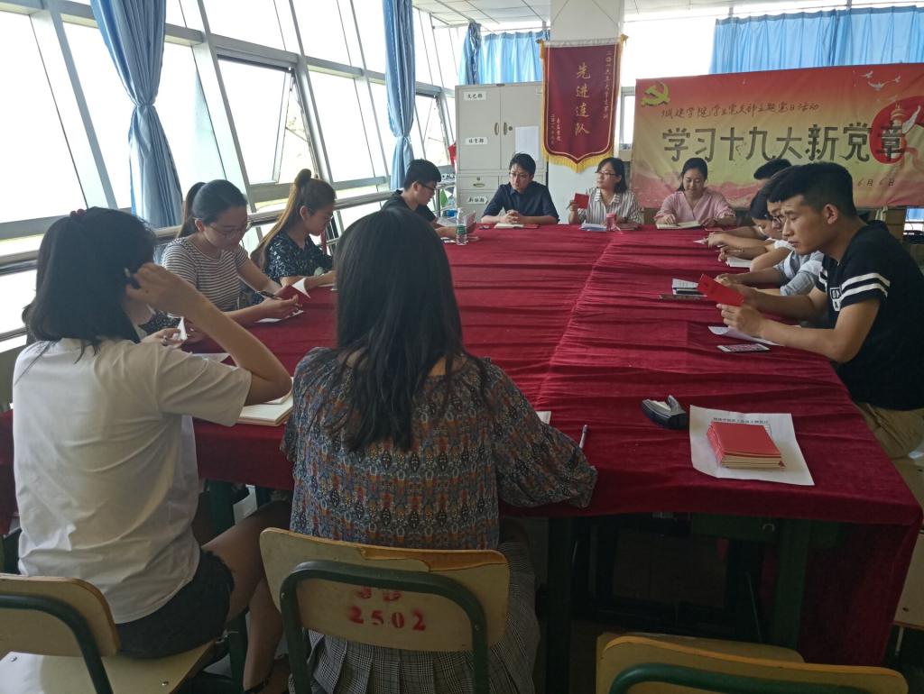 本次主题党日活动紧紧围绕“学习十九大新党章,为学校硕士学位授予单位立项建设做贡献”展开。会上,结合前期学习进展,各党支部书记带领党员同志重点学习了党的十九大对党章做重大修改的内容,并对新修订的《中国共产党章程》进行了全面系统的学习。各位党员同志一致认为,新党章是一部更加完善、更加符合时代要求的党章;对我们每一位党员来说,党章的修改也给我们提出了更高的要求,学习新党章、践行新要求是每个党员的义务。