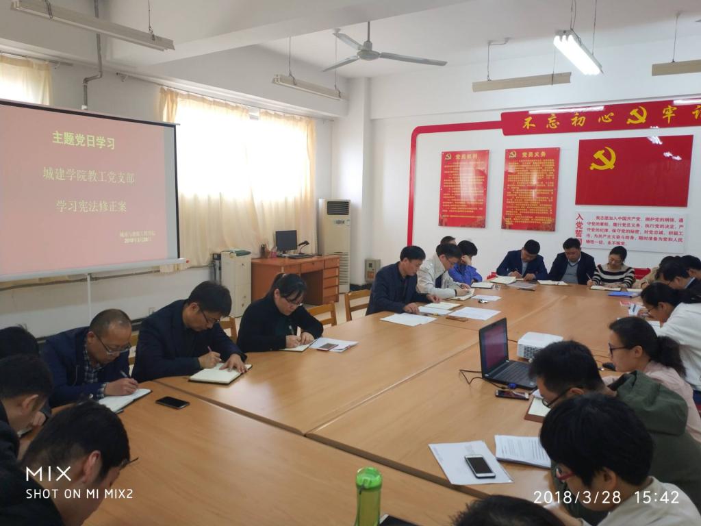 为了进一步学习贯彻习近平新时代中国特色社会主义思想、党的十九大、十九届三中全会和两会精神,落实依法治国方针,加强教师、党员师生法制观念,依法治学,依《永利集团章程》办学,城建学院在3月28日下午,利用“双周三主题党日”组织开展学习《中华人民共和国宪法修正案》。党总支书记李振清主持会议。