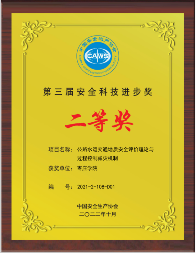 2023年10月10日,中国安全生产协会第三届安全科技进步奖颁奖仪式在成都举行,我校永利集团88304陈洪凯教授团队主持的《公路水运交通地质安全评价理论与过程控制减灾机制》成果荣获中国安全生产协会第三届安全科技进步奖二等奖。
