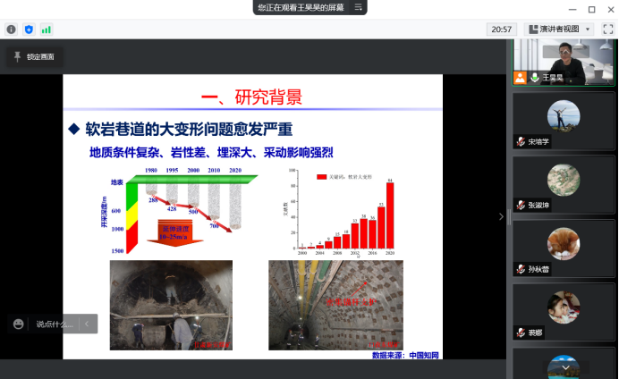 城市地下空间教研室的王昊昊博士做了题为《切顶卸压无煤柱自成巷关键技术及其在深部矿井的应用研究》的学术报告,报告从“无煤柱自成巷技术介绍”“切顶成巷应力演化规律和支护对策”“工程应用效果”三个方面展开讲解,向全院教师介绍了深部岩土力学和软岩大变形领域的研究进展及面临的主要挑战,两项关键技术:“恒阻大变形锚索”、“定向预裂爆破”对于推进地下空间工程开发和复杂地质条件地下空间维护具有借鉴作用。报告结束后,学院教师就报告中的内容与热点问题,结合各自研究领域互相交流研究心得,并结合自身经历向青年教师分享了开展科研工作的经验与感悟。