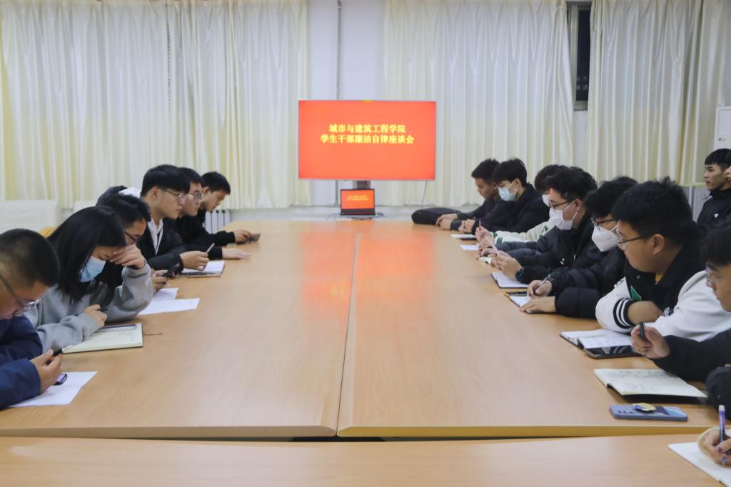 会议第二部分:进行学生干部廉洁自律座谈会。纪检部部长魏本铭、副部长国书源主持本次会议,并就学生干部的个人成长和发展提出四点意见:一是思想积极,主动学习政治理论,增强"四个意识",坚定"四个自信",做到"两个维护";二是发挥先锋模范作用,加强部门间协同配合;三是处理好学习和工作关系,重视工作能力和专业能力的培养;四是坚持新发展理念,树立发展意识。