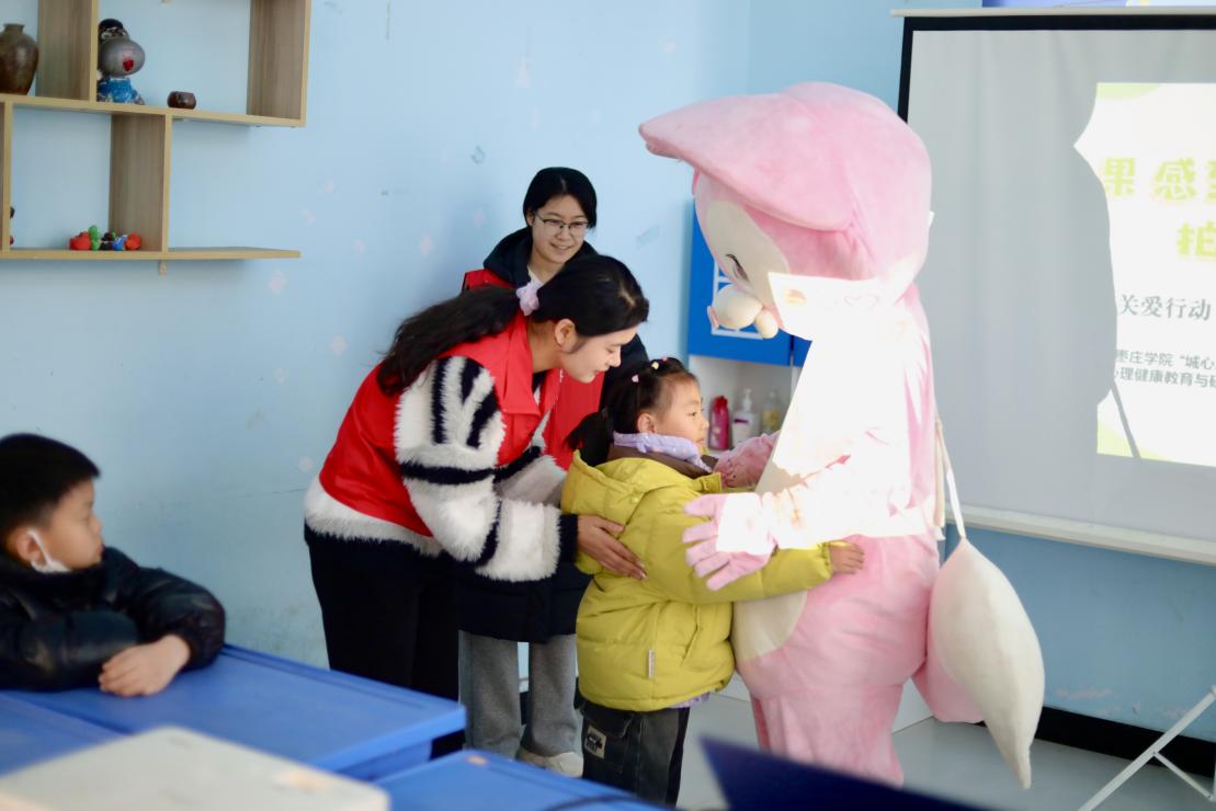 活动还特别设置了“情绪疗愈暖心驿站”环节。由志愿者扮演的卡通玩偶“暖心加油员”出现在现场,为每一位孩子送上真诚的“爱的抱抱”,通过温暖的非语言接触,传递支持与接纳,营造出安全、包容的情感表达氛围,有效缓解了孩子们的紧张情绪,增强了他们的心理安全感。