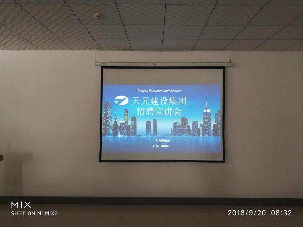 会议开始,由学院就业指导老师致辞,并对目前毕业生面临的就业环境做了简要说明,阐明了招聘会的优势以及进入事业单位的好处。随后,招聘会负责人高经理以ppt的形式就公司的注册地址,规章制度,企业文化,现有资质认证,仪器设备,组织构架,人力资源政策等多个方面向同学们做了简单介绍,并就实习期员工的福利待遇做了明确解释。本次公司招聘主招土木工程、工程管理、给排水工程等专业人员。其后,高经理对公司的细节进行了更为精细的阐述。最后,同学们积极踊跃的提出自己的问题与疑惑,招聘会负责人耐心的进行现场解答,并对同学们进行了应聘的利弊分析。企业方表示真诚的邀请同学们加入天元,实现自己的梦想!