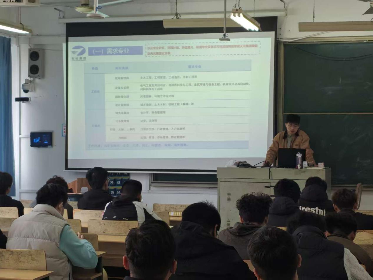 宣讲会上,天元集团吴迪、山东华铁航沈月华分别从发展历程、行业地位、业务布局等介绍了企业,随后,针对本次招聘的岗位需求、专业要求、招聘流程及薪资待遇等问题进行了详细说明。两家企业共推出工程技术、职能管理、安全服务等多个类别岗位,为新员工量身定制了“导师带徒”“轮岗实训”等成长计划,助力毕业生快速实现从校园到职场的转型。